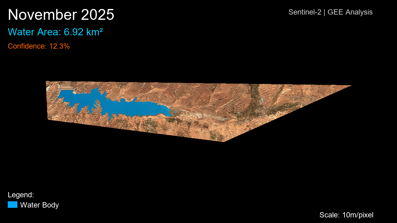 اگر فرض کنیم دریاچه سد طالقان یکی از منابع مهم ذخیره آب نزدیک پایتخت است، داستان تلخ از دست رفتن و تغییر حاشیه آبی این دریاچه از سال ۱۴۰۱ تا امروز با استفاده از تصاویر ماهواره‌ای Sentinel-2 و مرز بندی ابتدایی (همراه با درصدی خطا) در این تایم‌لپس ماهانه از فروردین ۱۴۰۱ تا آبان ۱۴۰۴ ذخیره شده است.